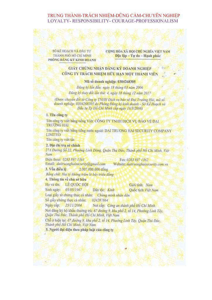 - Ngành nghề kinh doanh : Dịch vụ bảo vệ.
