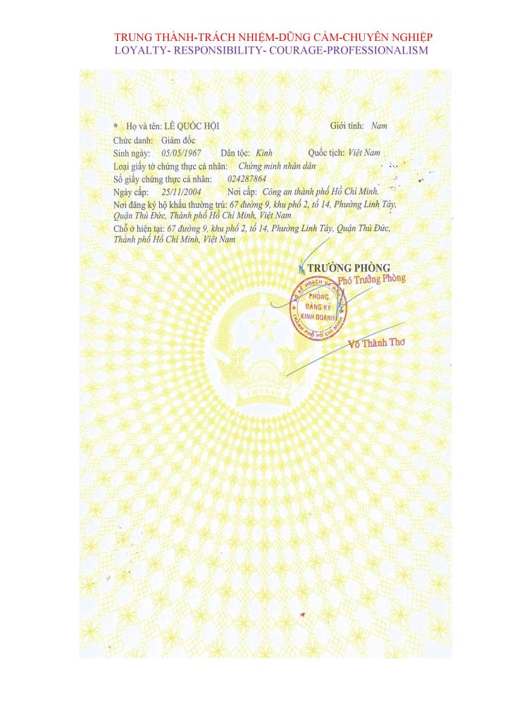 - Giấy chứng nhận đủ điều kiện về ANTT số: 116/GCN –Do CA TP HCM cấp.